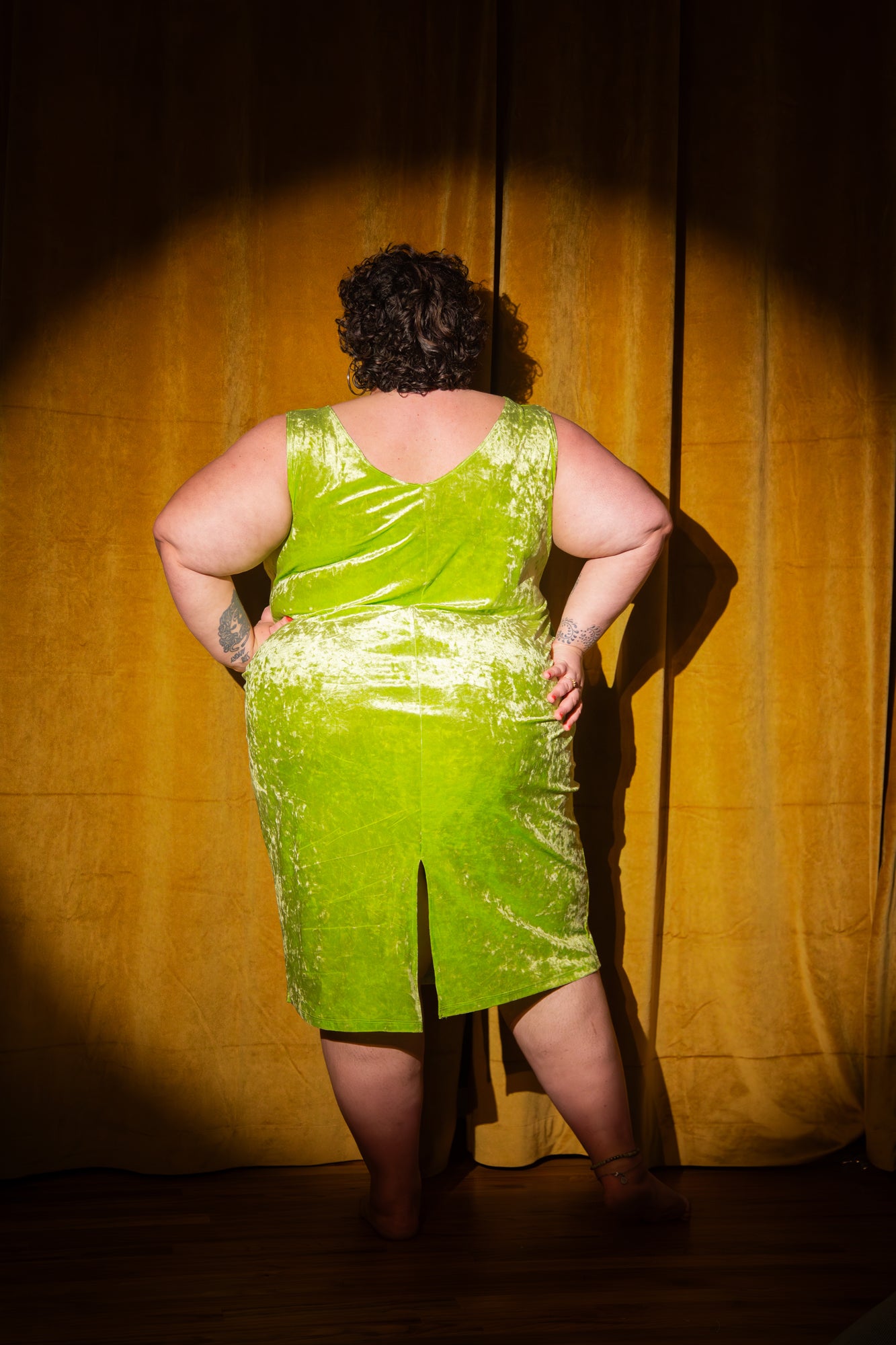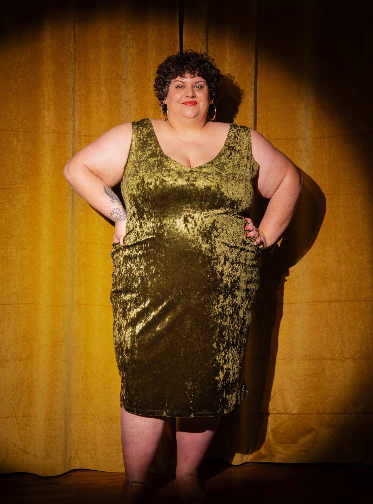 We love a simple versatile dress and we LOVE our crushed velvet! I got so many requests for a dress during the holidays since some people are at their maximum robe capacity. This is our original lounger cut with a crushed velvet twist! Deep v front and back, pockets on the hips, a sweet little slit in the back so you can walk around or lounge in comfort! This cut is sleeveless and a little more fitted than our usual styles. It’s perfect for all heights, if you’re particularly petite feel free to size down for a little shorter hem! You can also size up for a very relaxed fit if you’d like. Layer it with a coat or sweater, I actually love pairing mine with a cropped shirt for a pencil skirt look! It’s a glamorous way to lay around the house or a fantastic dress for a night out, definitely on the sexier side of styles!